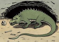 Perhaps the best-known creature of the Ozarks is the Gowrow. A lizard-like animal about 20 feet long, the Gowrow has enormous tusks, long incisors and canine teeth, short legs, and a vicious claw on each toe. Its body is covered in green scales and short spikes line its back. The Gowrow’s tail is long and thin, with a sharp, blade-like formation at the end. It lives in caverns and under rock ledges. It is a carnivorous creature, devouring great numbers of deer, calves, sheep, goats, and, according to some reports, human beings.