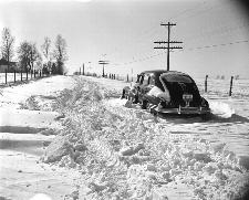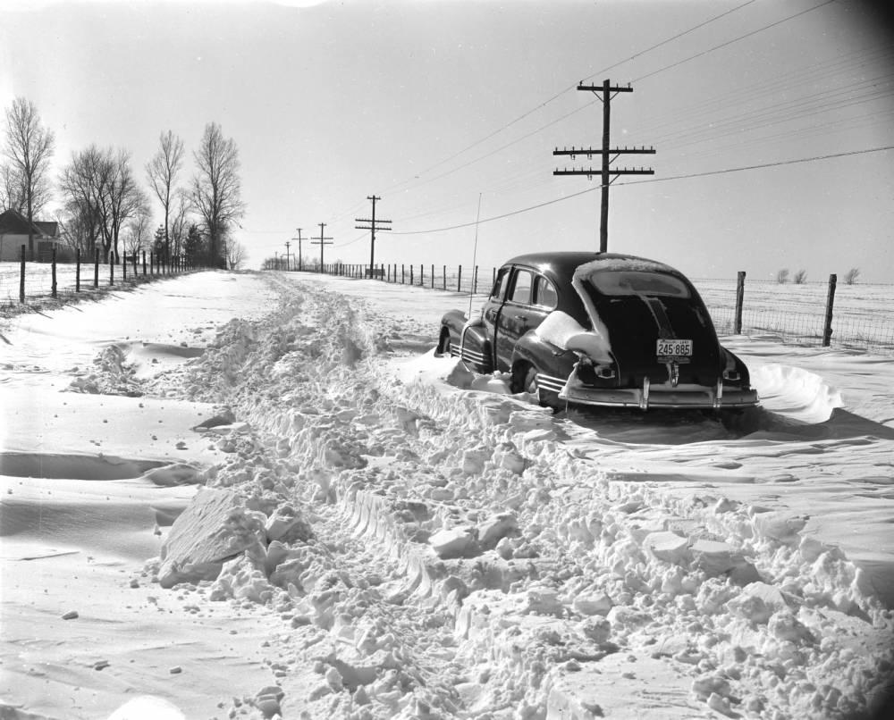 “Not all Springfieldians had fun in the snow. Many motorists, trying to travel on New Year’s Day, slipped into ditches or stalled in drifted roadways. This abandoned automobile [right] was photographed on Fremont Street Road, about one-fourth of a mile from County Road M. The tracks are those of a bulldozer, which had pulled stalled cars to safety.”